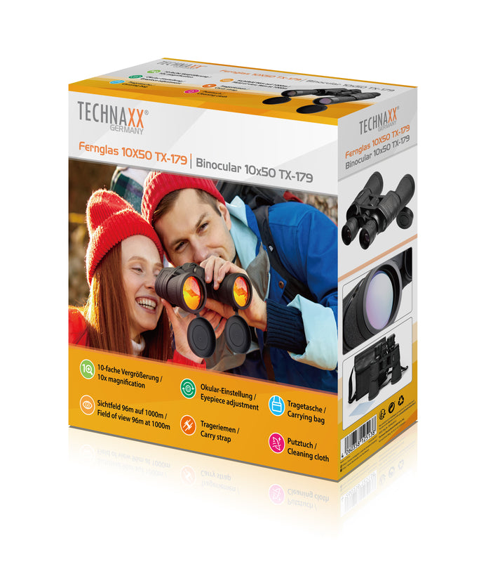 - Technaxx Fernglas 10X50 TX-179, Tragetasche, Trageriemen, Reinigungstuch, Benutzerhandbuch